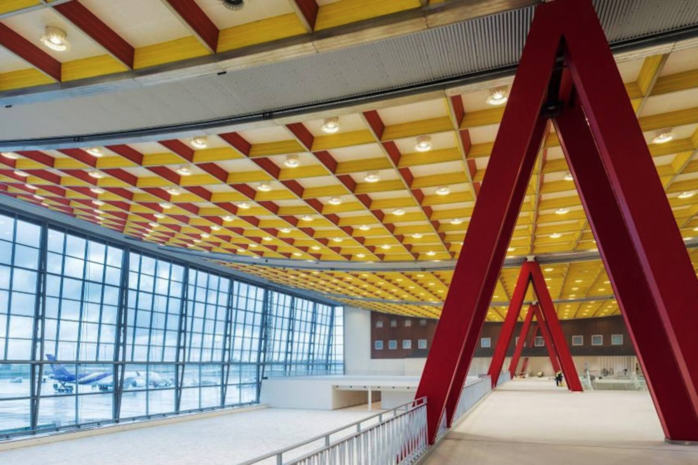 The large 1800 m2 curved bay window, also an innovation, directs the gaze towards the runways and the airplanes ballets.