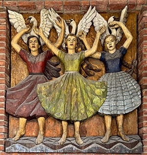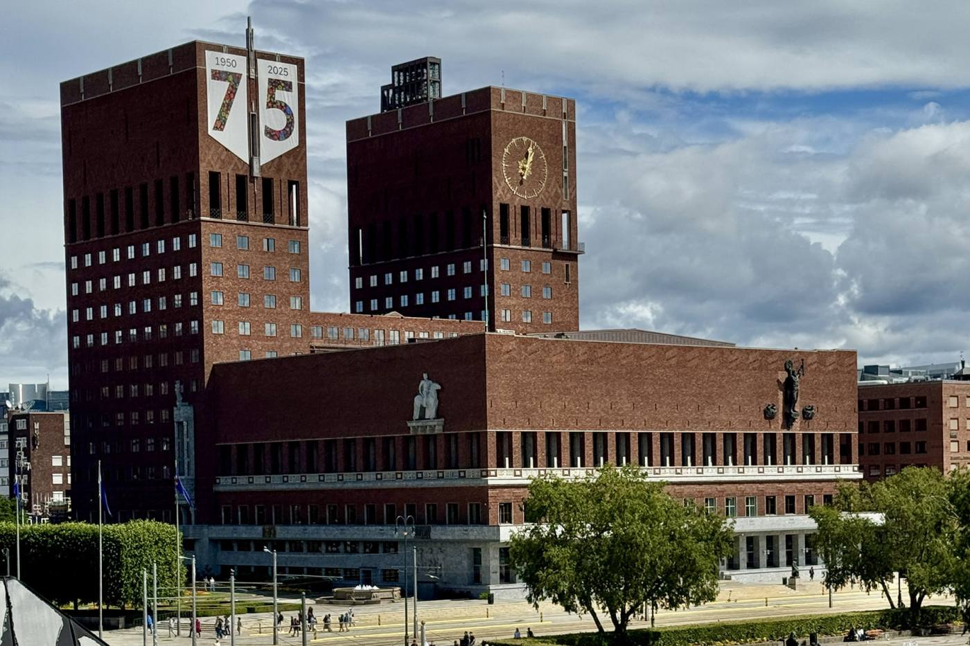 Autour du bâtiment, les figures tutélaires s’inscrivent également dans les formes sculptées. Harald Hardråde monte à cheval du côté ouest, tandis que saint Hallvard, patron de la ville, tend les bras vers le ciel. Dans un angle, une sculpture présente deux hommes et une femme. Le proxénète, la prostituée et son client ! Cette surprenante représentation fait référence au quartier des bordels de la ville d’Oslo qui se tenait là où aujourd’hui se dresse l’Hôtel de Ville.